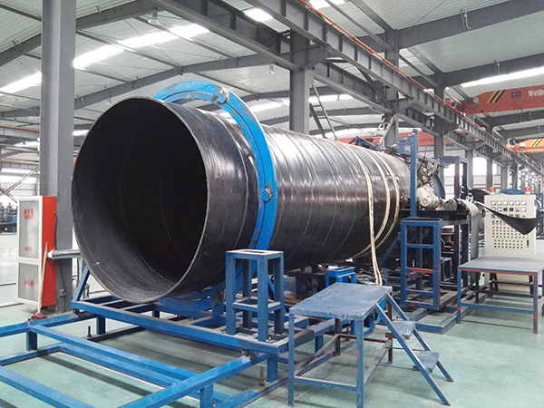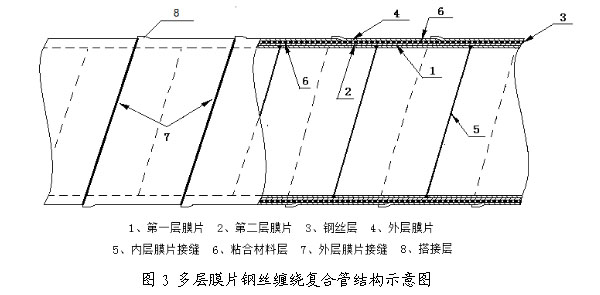 中等口径的中低压管道可由两层江南游戏·(中国)官方网站同向螺旋缠绕热合而成,中间夹一层镀铜“过塑”高强度碳素弹簧钢丝,其拉伸强度可达1800MPa~2000MPa。每层江南游戏·(中国)官方网站都先在特种设备上复合一薄层高强度粘合材料。复合管材时外层江南游戏·(中国)官方网站的中线紧压在内层江南游戏·(中国)官方网站的接缝上。内层江南游戏·(中国)官方网站接缝在复合时先用焊枪焊接,外层江南游戏·(中国)官方网站接缝则采用搭接方式连接。两层江南游戏·(中国)官方网站敷胶面相向,连同钢丝大面积螺旋缠绕热压粘合,其粘合强度远超普通聚乙烯钢丝缠绕复合管。大口径管道则由3~4层江南游戏·(中国)官方网站加钢丝复合。管材结构详见图3。